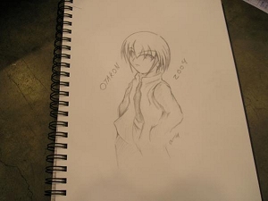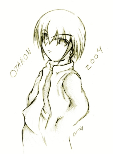 I drew this during the last day of Otakon 2004. Everyone was gathered on the floor of the Artist Room, waiting for the convention to end. Ahh...such good times we had. Scarab actually took a picture of it in my sketchbook after I had finished, which is seen below. ^_^;