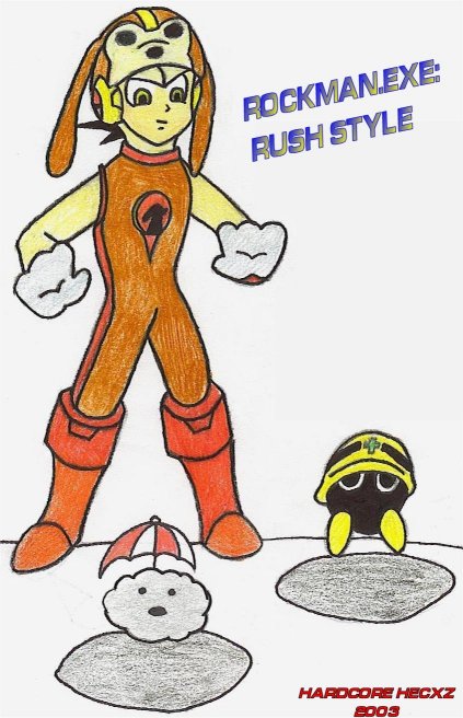 A special Style change that I made up from Ideas I saw in the Anime. Back in the Original Rockman and Rush was a team and would combine together to make a stronger version, this is where the idea of Rush Style came to mind. In net battling, Rockman can use a pop-up (Rush) battle chip and turn into Rush Style for his turn. Now Rockman has all the powers Rush had in the anime, to summon black holes that create viruses that Rockman can use to fight against his enemies.