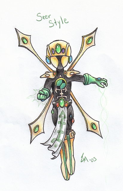 Warlock - The powers of a Seer are not limited to precognition alone. A Seer can use his mental power in far more destructive ways. Rockman can channel this destructive energy through his Rockbuster, and then, given further concentration, enhance it through the runes that extend from his back. This power combined with sensitivity to his enemys' movements makes for an impressive attack, able to strike even the quickest of foes.