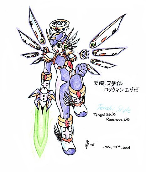 Description: A style that was previously not known to exist. It has powerful aerodynamic skills, and increases Rockman's speed and accuracy. Due to enhanced programming, TenshiStyle is able to manipulate the Net's data into allowing him to fly. His design is meant to resemble an arch angel. When his wings are damaged, he falls to the ground as is temporarily less stealthy. His wings are a major source of his power, and the halo above his head is the greatest source of power. Seemingly invincible in this Style, Rockman can be knocked unconscious or deleted with a single hard blow to the halo. Such is the price to pay for greatness.