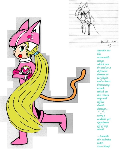 Ryouko.EXE has retractable wings, which can be used as a defensive barrier or for flight, and a heart boomerang attack, which on the return trip with inflict double damage.... ^_^; sorry I couldn't get Quickman off of my mind!
