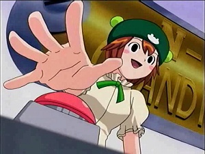 Midorikawa Kero was in charge of hitting the giant red button, which would then pick who got to fight in the Consolation Match of the N1 Grand Prix. Here she's about to push the button, yelling "