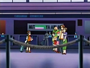 One of the few other shots that I got from episode 26. Here, everyone is seeing Netto off as he heads out on his trips around the world. This was the prize he was given for coming in second place at the N1 Grand Prix.
