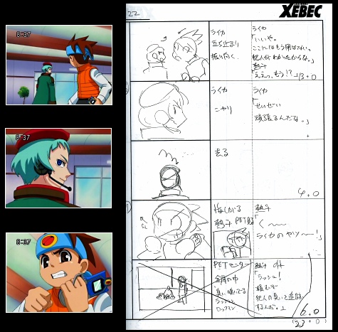 Netto becomes a little more than perturbed when Laika doesn't let him in on the details of the criminal they are investigating. Instread, Laika just leaves him to fend on his own. After the arrogant little Net Savior leaves, Netto calls upon his friend Rush to aid him. I find it interesting that the storyboard originally had Rush with Rockman, but in the final version he is alone.