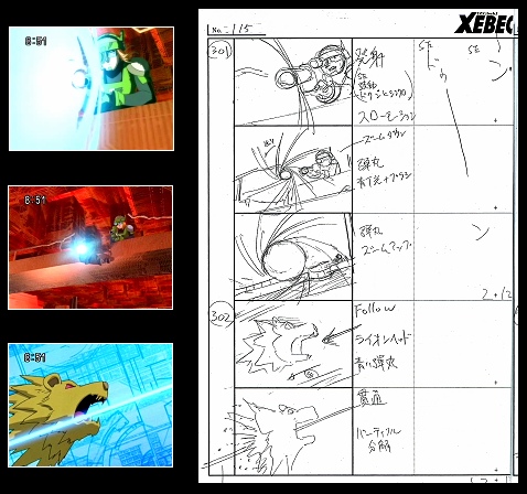 Searchman decides to play the hero in saving Rockman, but missing Desertman entirely with his rifle shot, and instead cooling the lava beneath Rockman to break his fall. In the original storyboard, we see that his rifle shot also fires through the "Royal Lion Head" attack from Desertman - but in the anime it misses it completely instead!